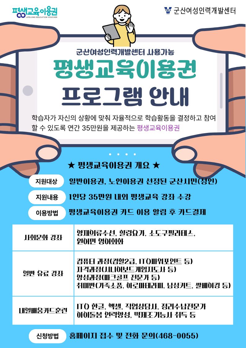 군산여성인력개발센터는 평생교육이용권 사용기관으로 다양한 평생교육이용권프로그램을 운영하고 있어 안내드립니다.