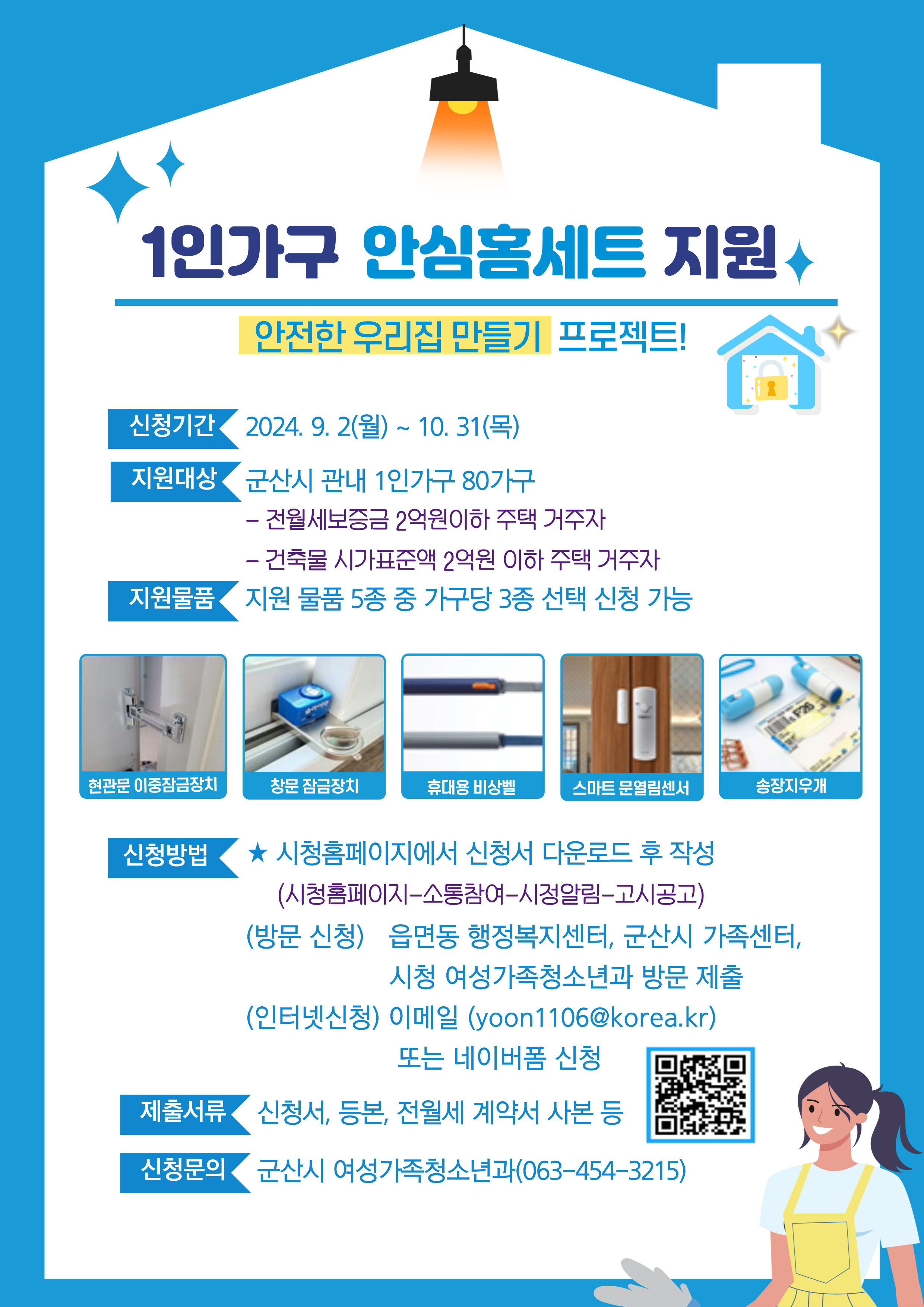 지원물품 | 현관문 이중 잠금장치, 창문 잠금장치, 휴대용 비상벨, 스마트 문열림 센서, 송장지우개 (5종 중 최대 3종) | ||||