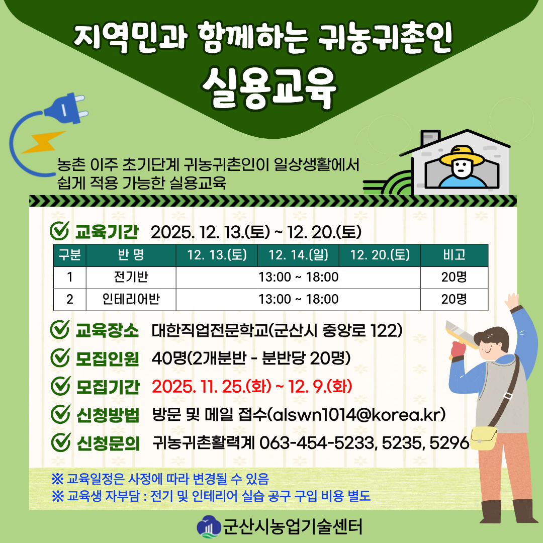 귀농귀촌인이 일상생활에서 쉽게 적용가능한 실용교육(전기반, 도배)을 통해 농촌생활에 대한 만족도 증진과 함께 지역민과의 소통, 화합을 위한 2025년 지역민과 함께하는 귀농귀촌인 실용교육을 붙임과 같이 실시하니 참가 희망자께서는 기한내 신청하여 주시기 바랍니다.
