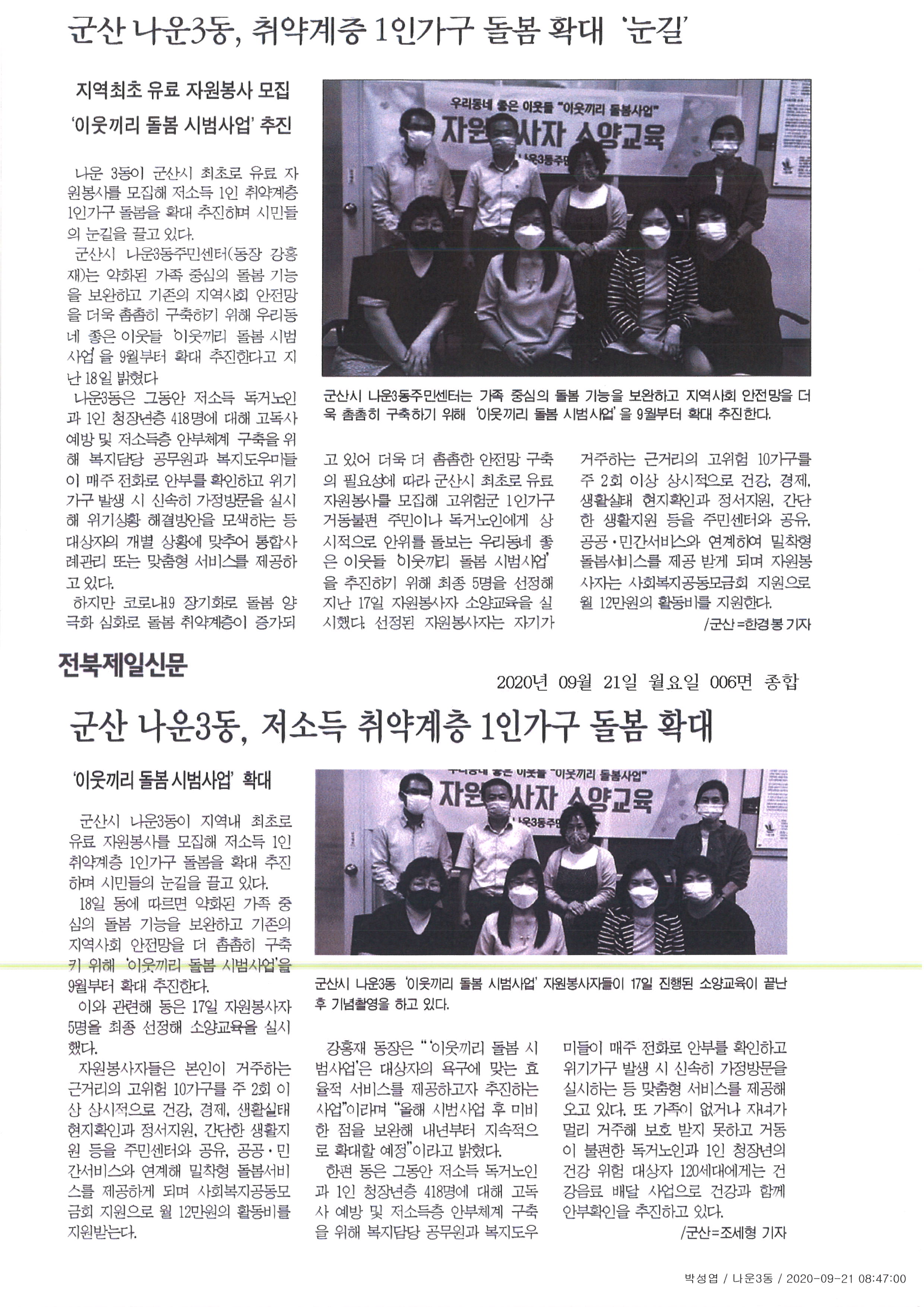 군산시 나운3동이 지역내 최초로 유로 자원봉사를 모집해 저소득 취약계층 1인가구 돌봄을 확대 추진하였습니다