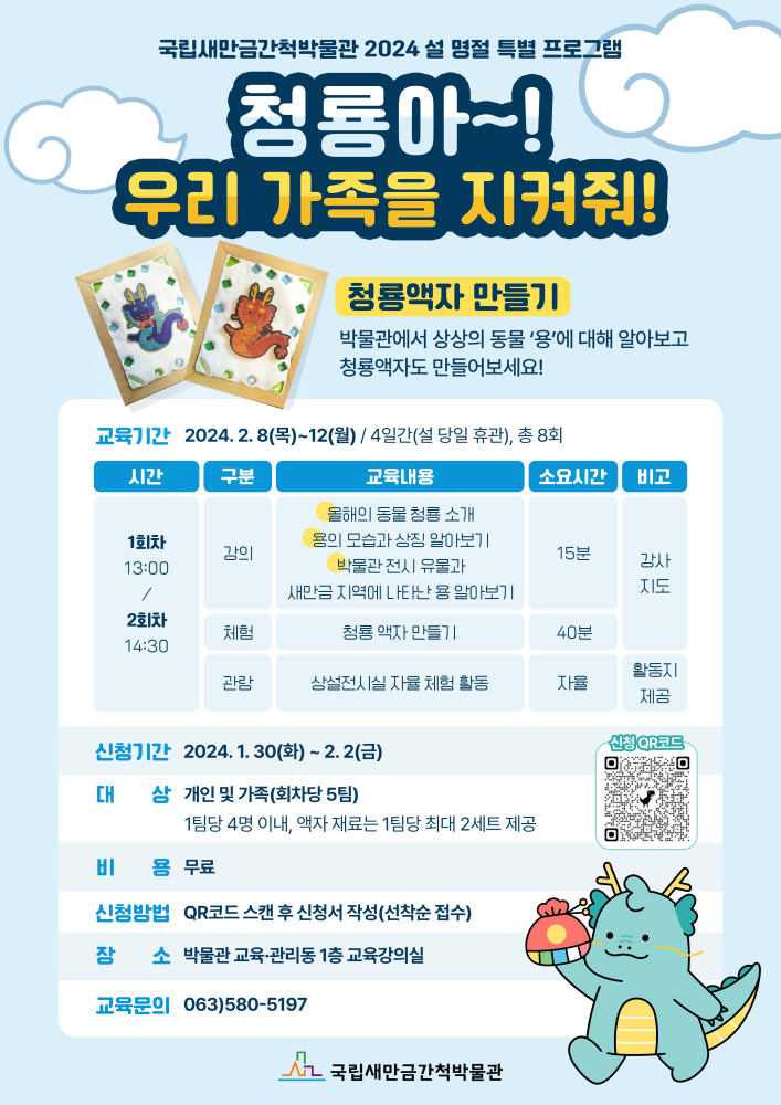 | 661 | 국립새만금간척박물관 2024년 설 명절 특별 프로그램 <청룡아~! 우리 가족을 지켜줘!> |