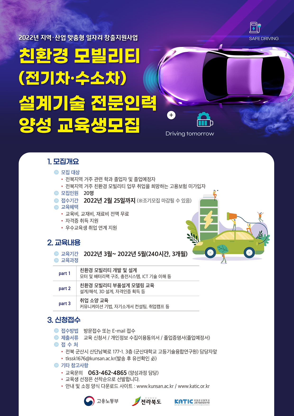 ○ 모집대상: 전북지역 거주 중인 관련학과 졸업자 및 졸업예정자 또는 친환경 모빌리티 업무 취업을 희망하는 고용보험 미가입자