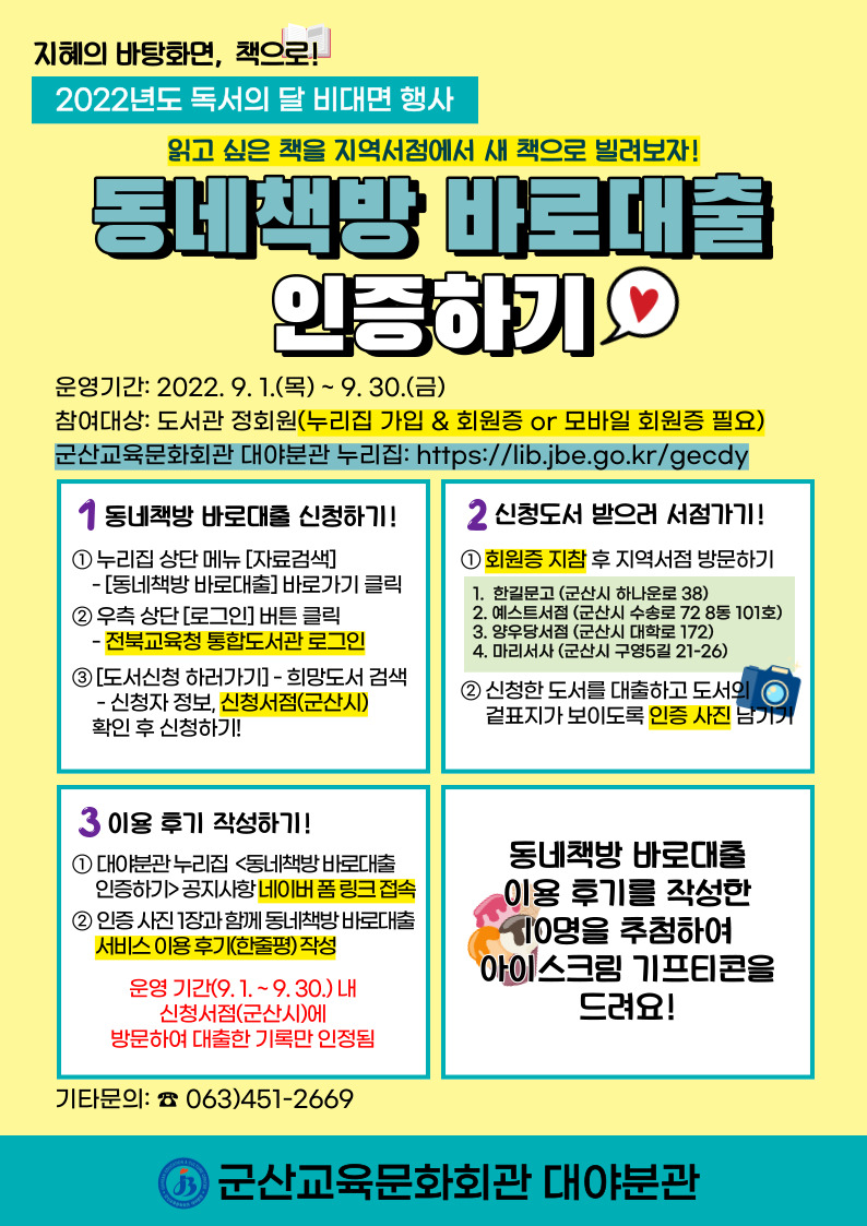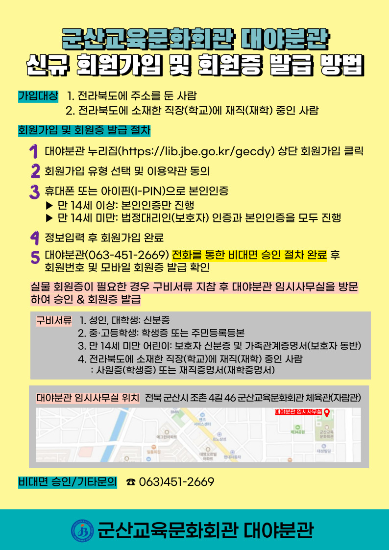● 기타문의: 대야분관 ☎ 063)451-2669 (누리집: https://lib.jbe.go.kr/gecdy )