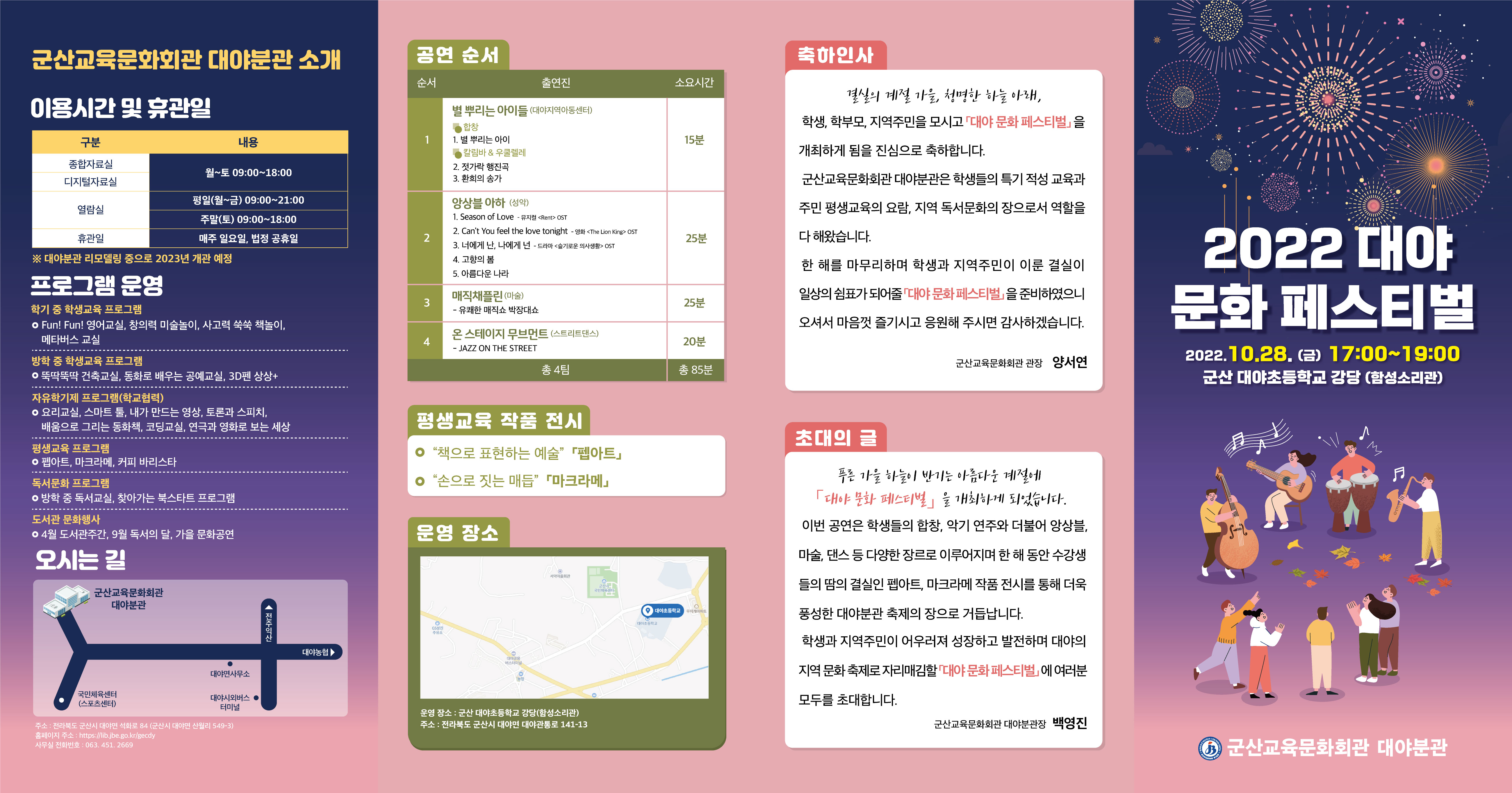 ★ 기타문의: 군산교육문화회관 대야분관 ☎ 063)451-2669 (누리집:https://lib.jbe.go.kr/gecdy)