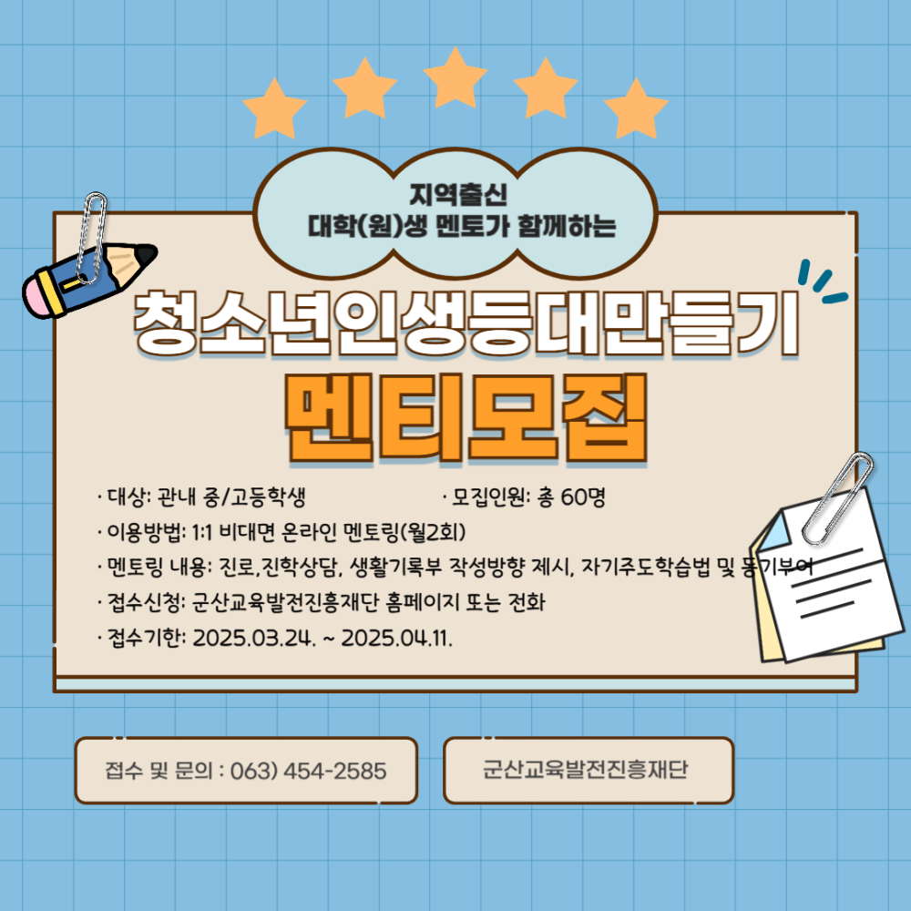 | 31 | 지역 출신 대학생 멘토가 함께하는 "청소년 인생등대 만들기" 멘티 모집 안내 |