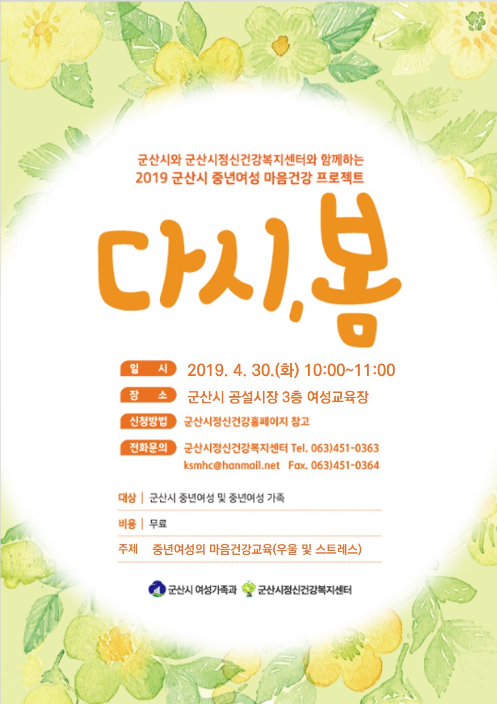 43 [다시, 봄] 중년여성 마음건강교육 참여 안내 다운받기 건강관리과 19.04.24 1877