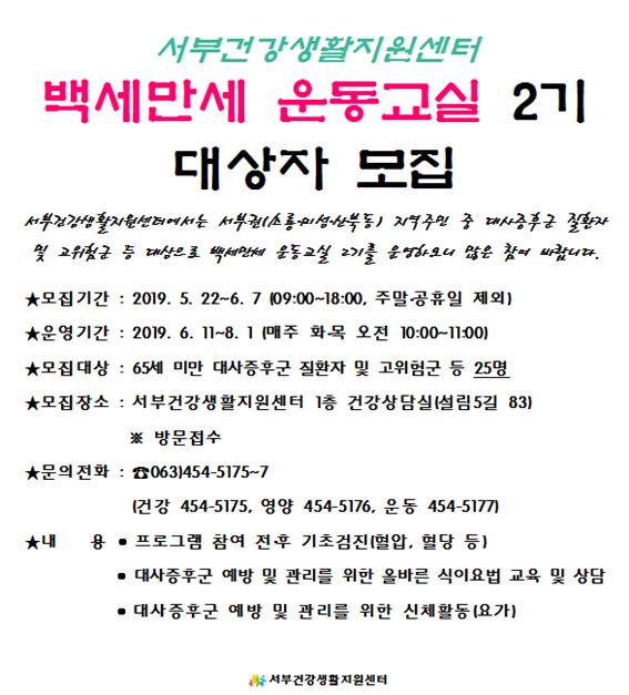 45 서부건강생활지원센터 백세만세 운동교실 2기 대상자 모집 다운받기 건강관리과 19.05.22 1817