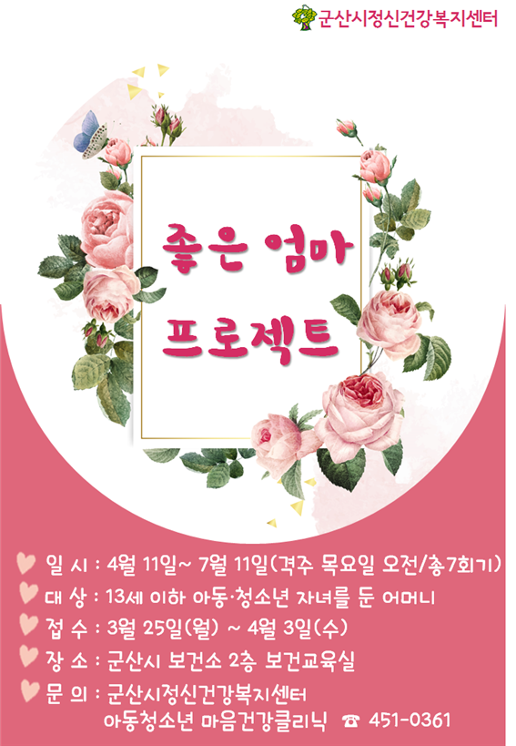 2020년 상반기 군산시 여성사회대학의 수강생을 아래와 같이 모집합니다. 자세한 내용은 첨부한 전단지를 참고해주시기 바랍니다. 1. 모집기간 : 2020. 1. 6. ~ 1. 23.(14일간) ※ 교육기간 : 2020. 2. 3. ~