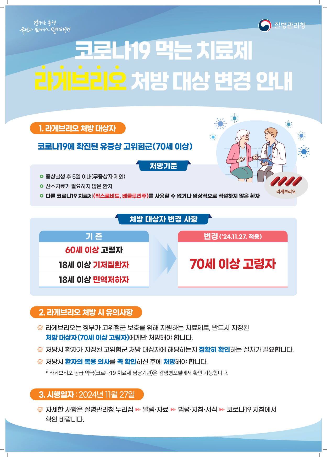 2024. 11. 27.(수) 부터 코로나19 먹는치료제(라게브리오)의 처방 대상이 변경되어 안내드립니다.