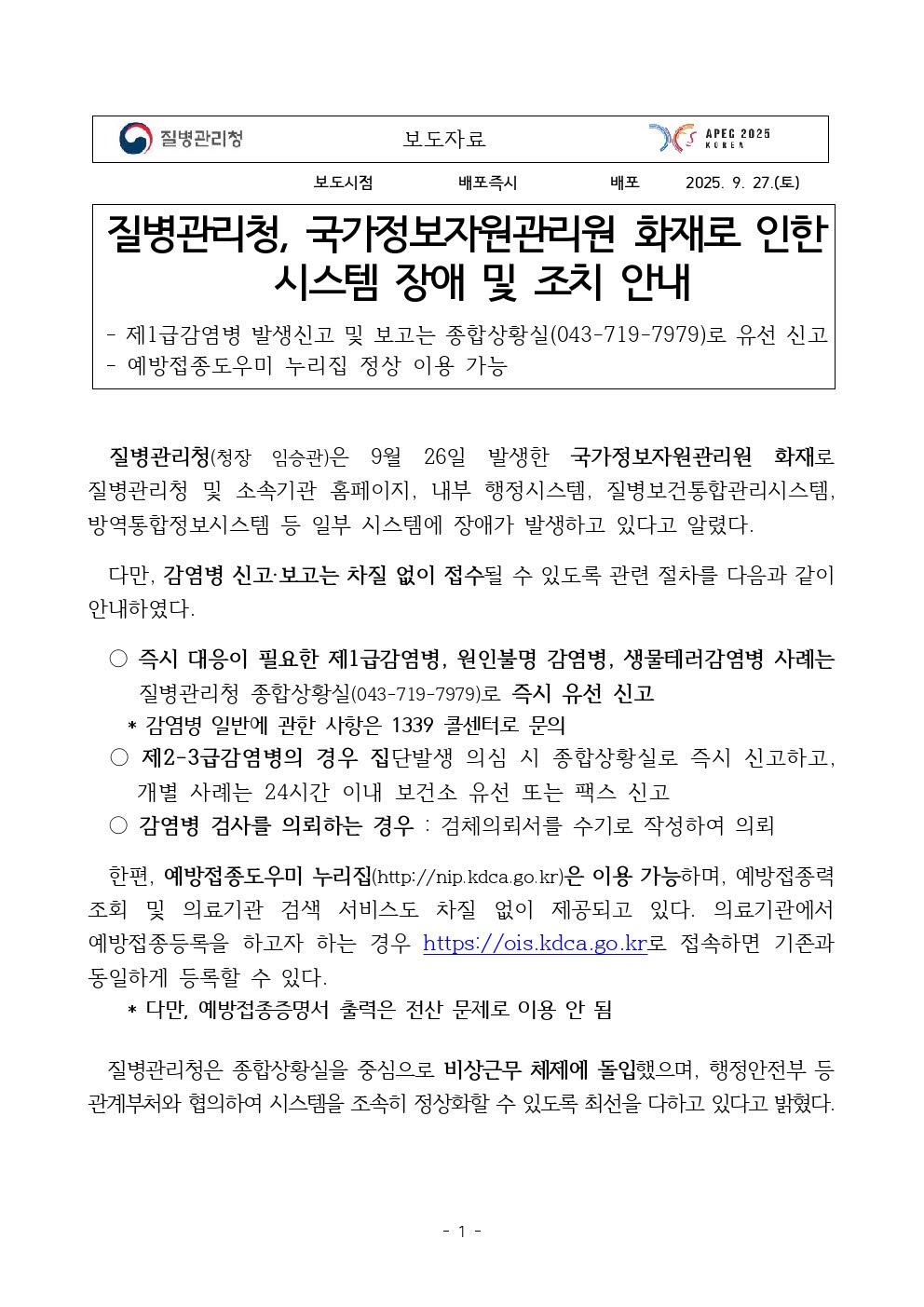 1. 질병관리청은 2025년 9월 26일 발생한 국가정보자원관리원 화재로 질병관리청 소속기관 홈페이지, 내부 행정시스템, 질병보건통합관리시스템, 방역통합정보시스템 등 일부 시스템에 장애가 발생하고 있습니다.