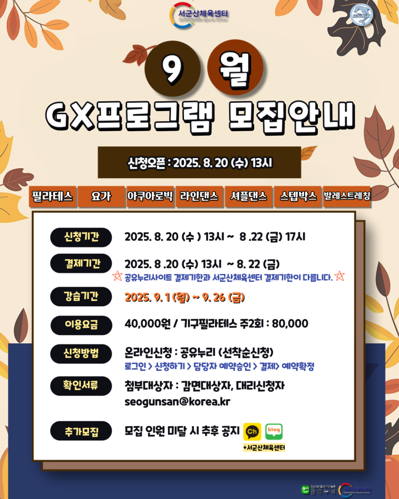 | 215 | 서군산체육센터 GX프로그램 추가모집 (9월) |