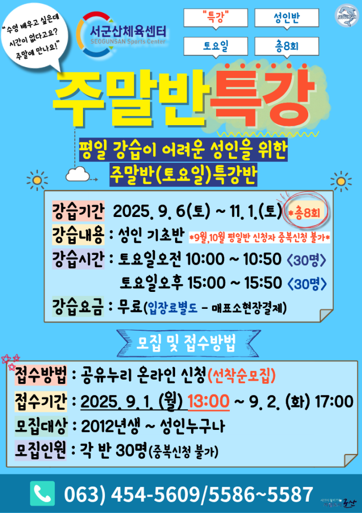 | 216 | 서군산체육센터 수영강습 주말반(토요일) 특강반 모집 안내 |
