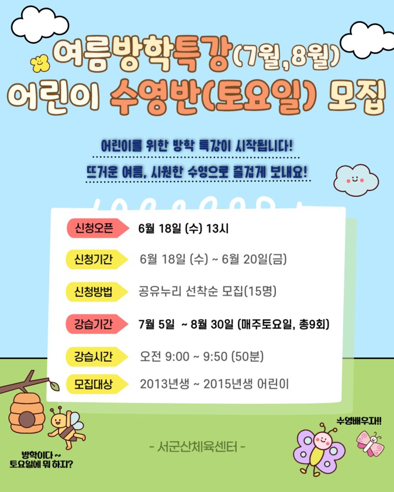 | 198 | 서군산체육센터 어린이 여름방학특강 안내문(7월 ~ 8월/ 토요일) |