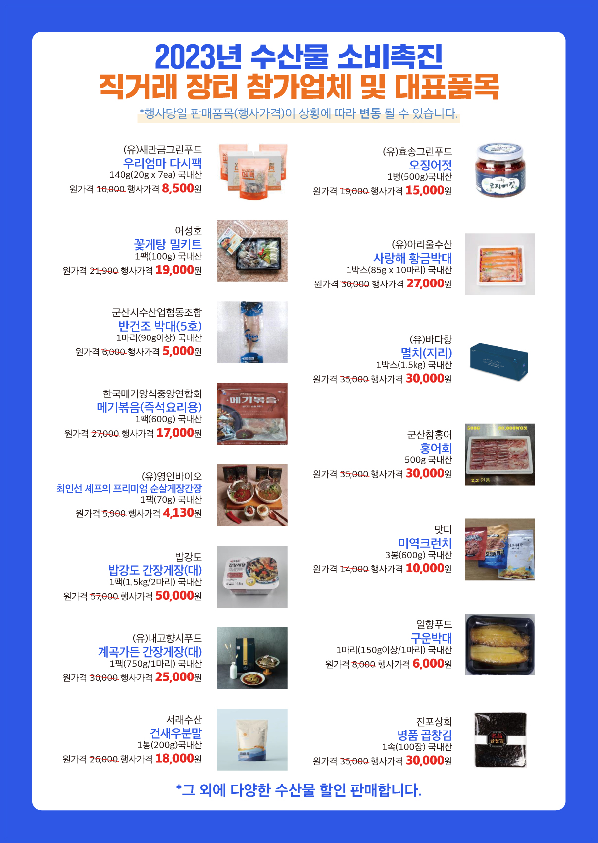 ❍ 행사규모 : 군산시 소재 어업인, 생산자단체, 수산물 유통·가공업체 등 약 15개소 참가