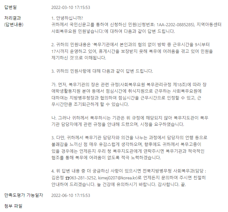 1. 평소 시정발전을 위해 관심을 가져주신 귀하께 깊은 감사를 드립니다. 귀하께서 건의하신 사항에 대하여 답변 드리겠습니다. 2. 귀하께서는 휴게시간 및 복무지 재지정 관련하여 센터장과 의견을 나누는 과정에서 그에 대한 부당함을 느끼고 민원을 제기하신 것으로 이해됩니다. 3. 센터장과 면담을 하는 과정에서 불쾌감을 느낀 점 매우 유감스럽게 생각합니다. 앞으로 복무하는 과정에서 불편함을 느끼지 않도록 센터에 지도·감독을 하도록 하겠습니다. 4. 귀하의 문의 사항에 만족스러운 답변이 되었기를 바라며, 답변 내용에 대해 더 궁금한 사항이 있으실 경우 언제든지 아동청소년과(☎454-4188)로 연락주시면 친절히 안내해 드리겠습니다. 감사합니다.