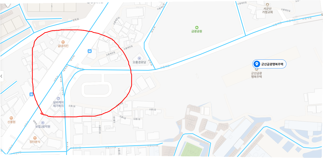 금광행복주택 아래 월명동으로 향하는 큰 도로가 있습니다. 하지만 그 반대쪽 나운동, 수송동으로 향하는 도로가 막혀있어 어쩔수 없이 아파트 단지(LH 짓는중), 주택단지를 우회해야하는 주민들의 불편사항이 있는것으로 보입니다. 아래 붙임 문서의 현 위치에서 좌회할수있는 신호등을 설치를 건의드립니다.