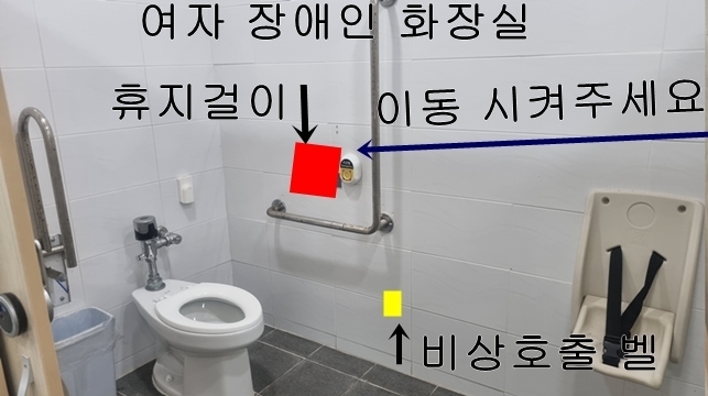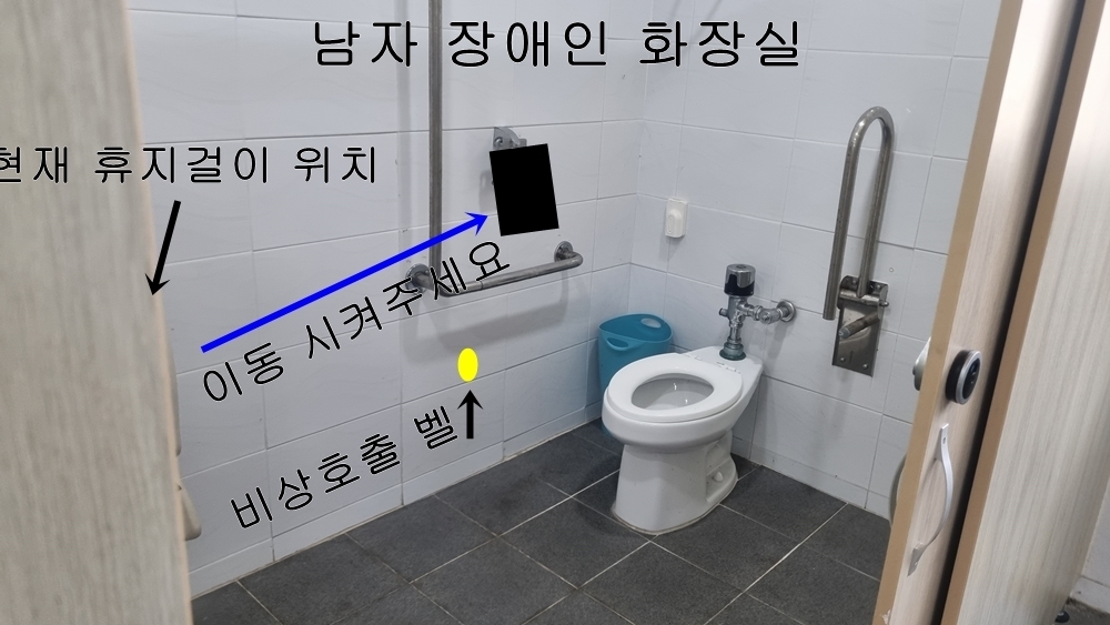남자 장애인 화장실 또한 휴지걸이가 입구옆에 있어 사용하기 불편합니다.