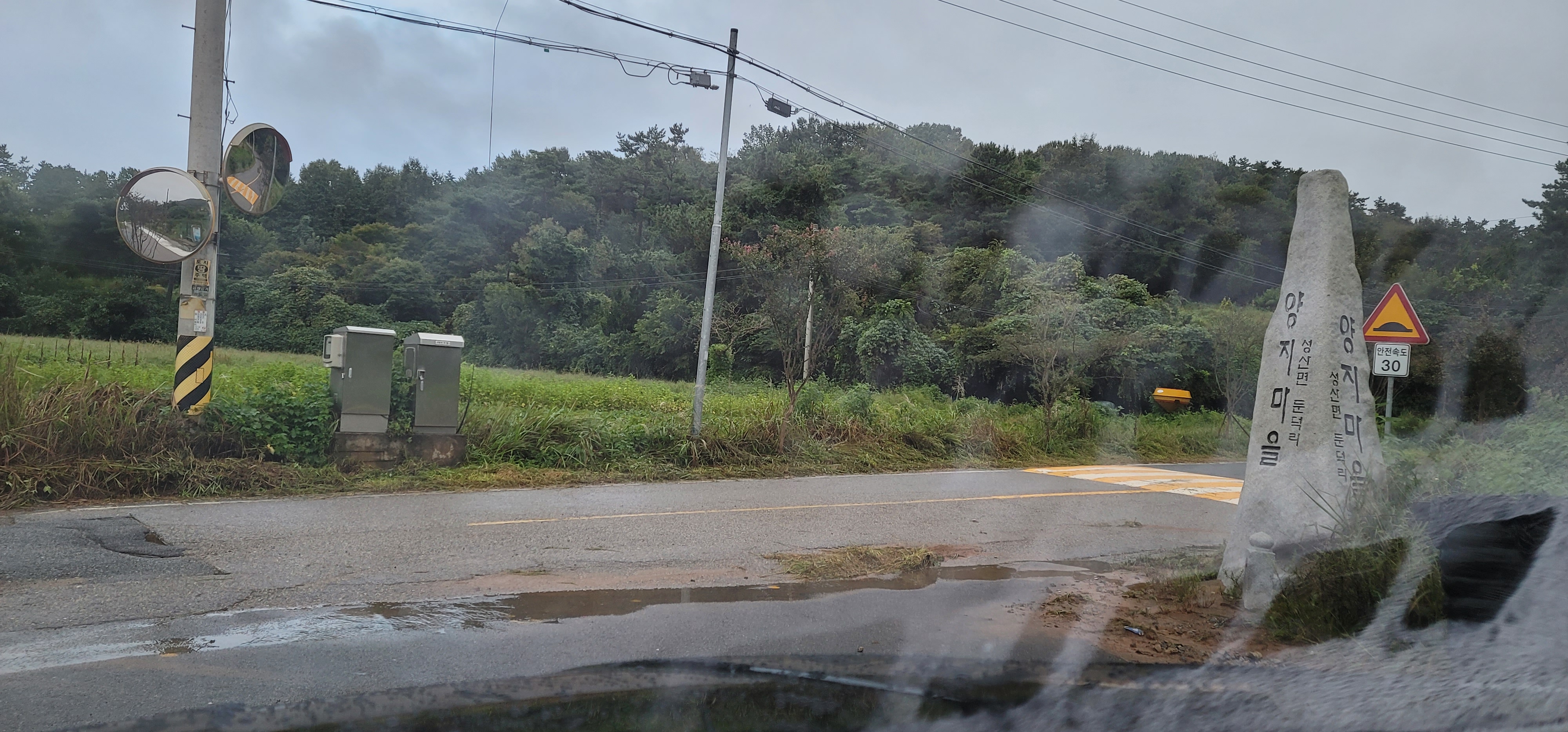 양지마을 비석에 세워진 곳을 중심으로 오성산 방향 에서 성산면 소재 방향까지 빗물이 도로로 범람하여 운행에 불편함이 많네요