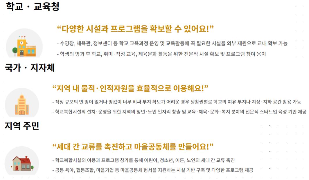 교육부에서 지역 발전을 위해 향후 5년간 약 200여개의 학교복합시설을 설치할 계획이라고 합니다