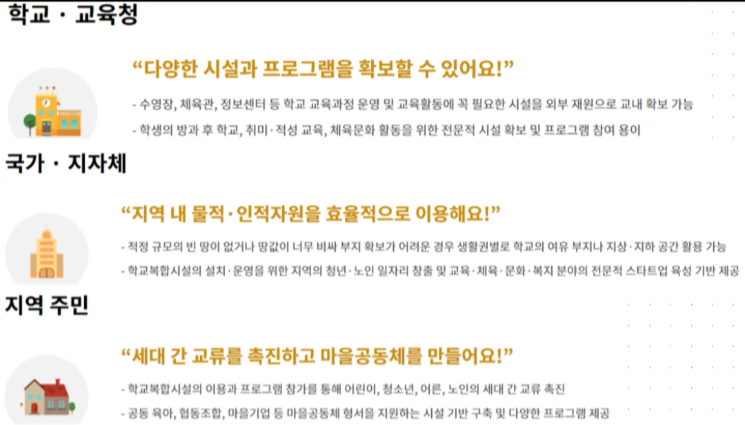 교육부에서 지역 발전을 위해 향후 5년간 약 200여개의 학교복합시설을 설치할 계획이라고 합니다