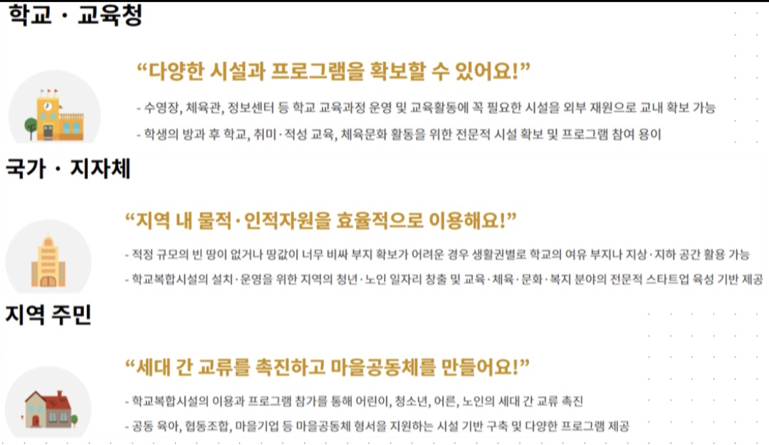 교육부에서 지역 발전을 위해 향후 5년간 약 200여개의 학교복합시설을 설치할 계획이라고 합니다