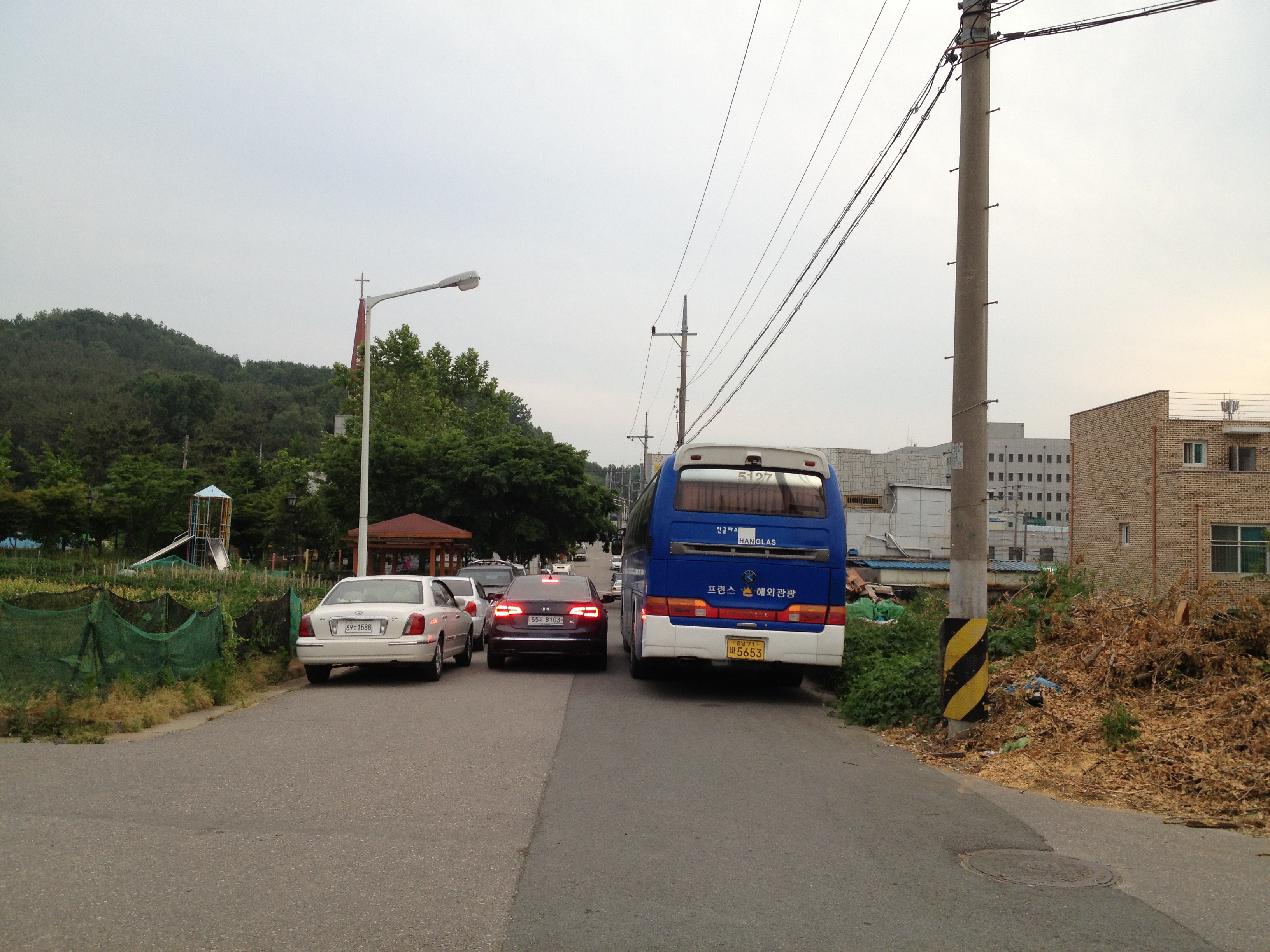 불법 주차하는 저 차량들에 대해 단속을 더욱 강화해 달라는 말을 했음에도 불구하고, 사진에서 보는 바와 같이 여전히 아랑곳하지 않고 트럭이 양쪽으로 주차를 해놓고 있고, 프린스 관광버스 차량 사이로 아슬아슬 승용차가 겨우 지나갈 정도입니다.