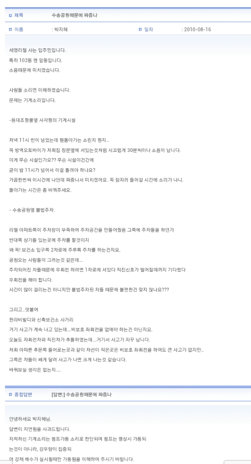 수송공원에서 기계소리때문에 잠을 자기 힘들다고요.