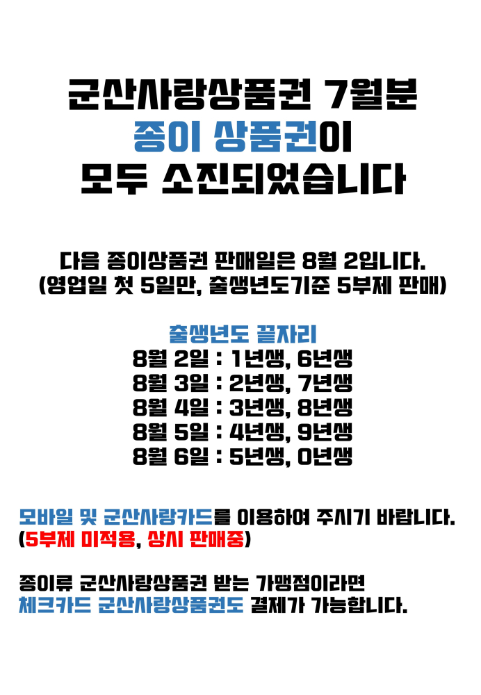 | 84 | 군산사랑상품권 (종이류 7월) 소진되었습니다 |