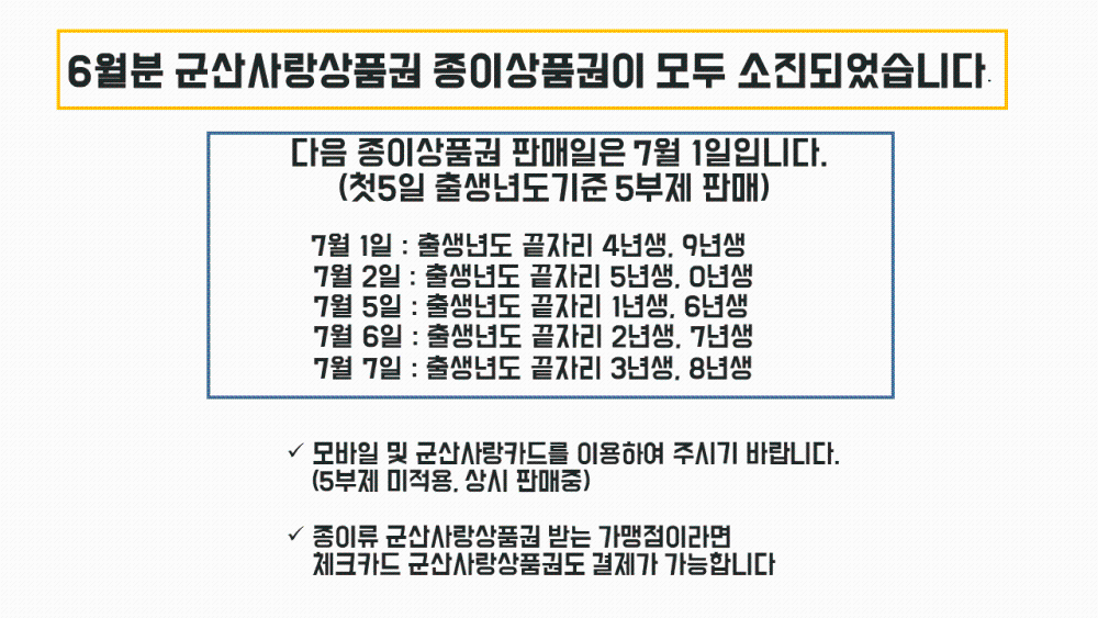 | NOTICE | 군산사랑상품권 유효기간은 5년입니다! |