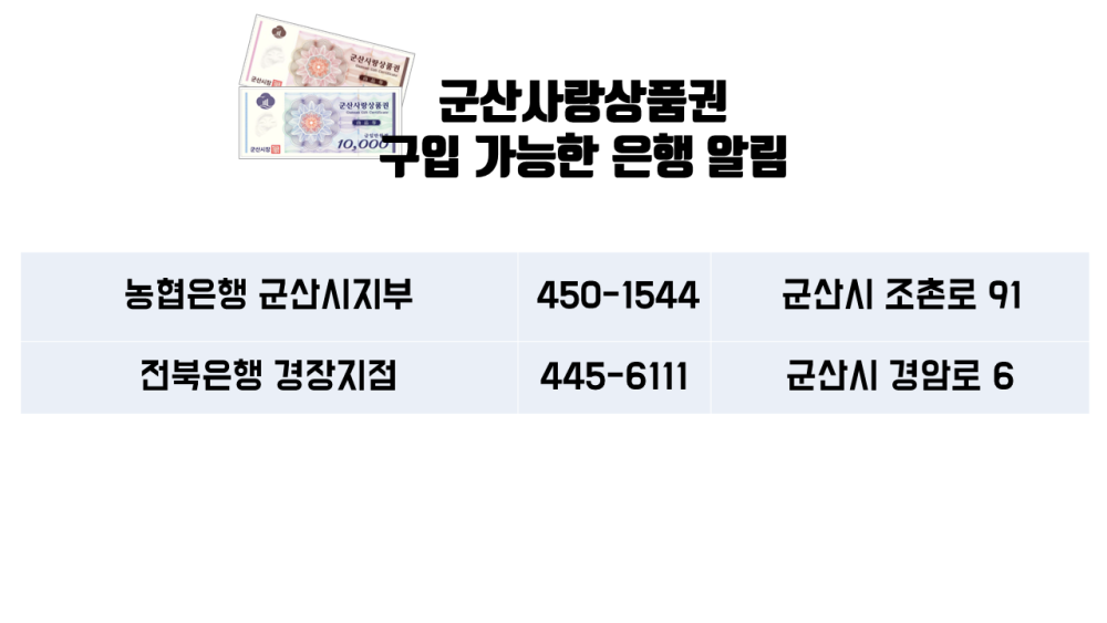 | 100 | 군산사랑상품권 (종이류) 구입 가능한 은행 알림 (21.09.13. 09시기준) |