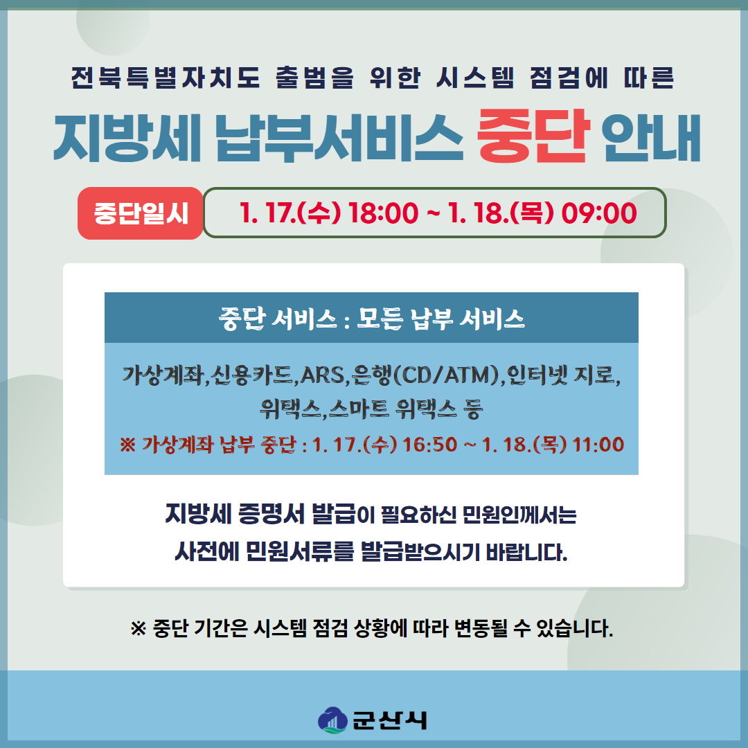 | 1244 | 전북특별자치도 출범을 위한 시스템 점검에 따른 지방세 납부서비스 중단 안내 |