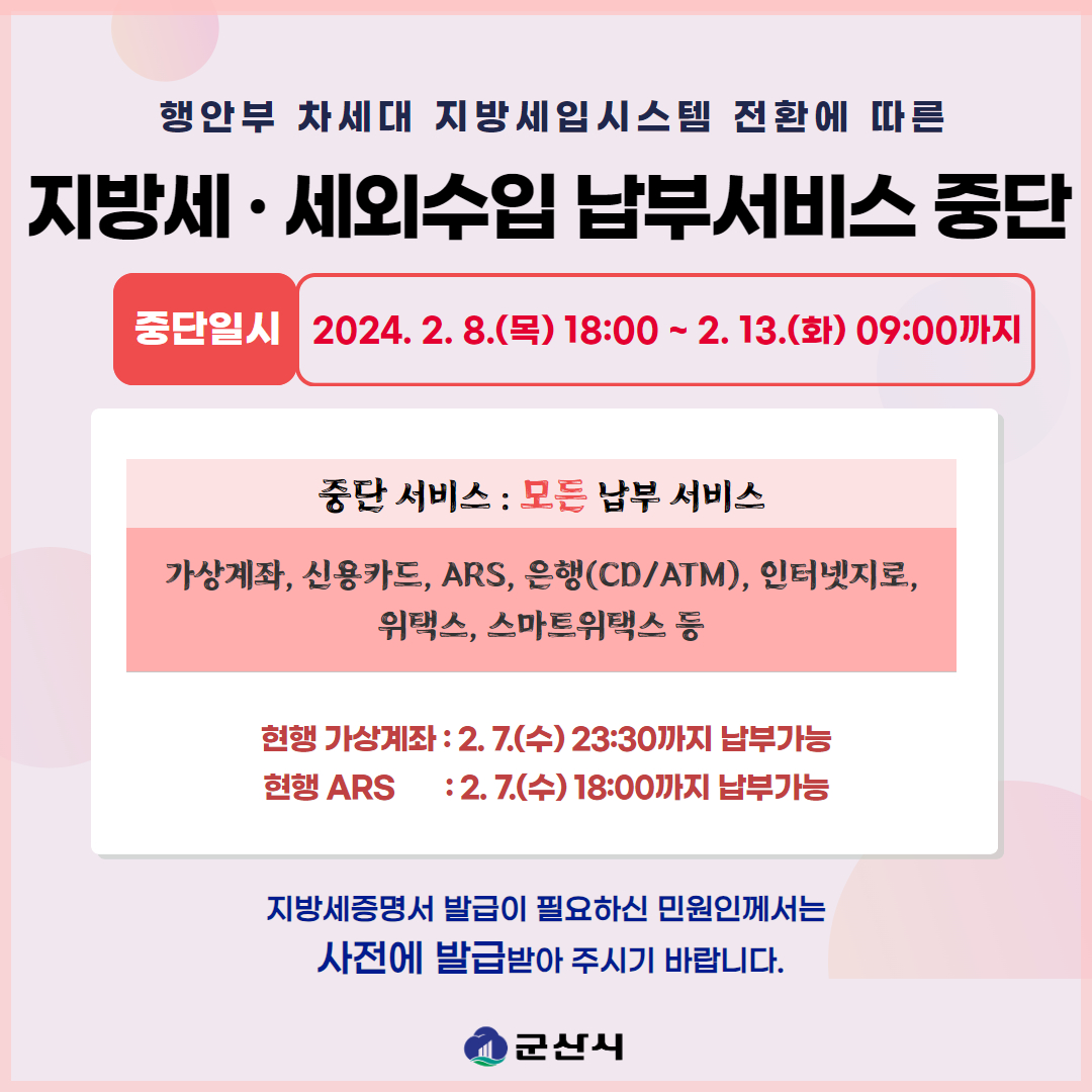 행안부 차세대 지방세입시스템 개통(2024.2.13.) 따른 시스템 전환 작업으로 인하여 지방세 납부서비스가 다음과 같이 중단
