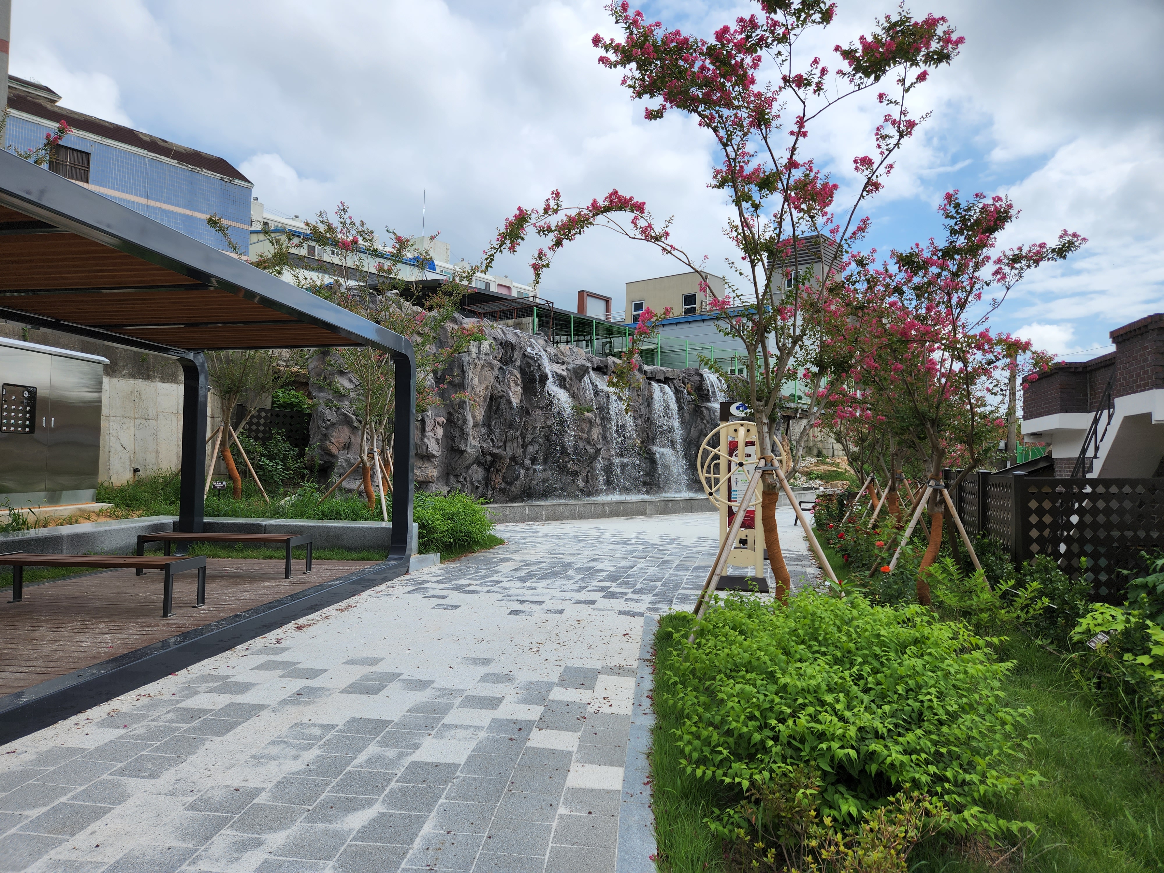 소룡동 도시재생뉴딜사업의 일환으로 조성된 선형공원 벽천분수 및 바닥분수를