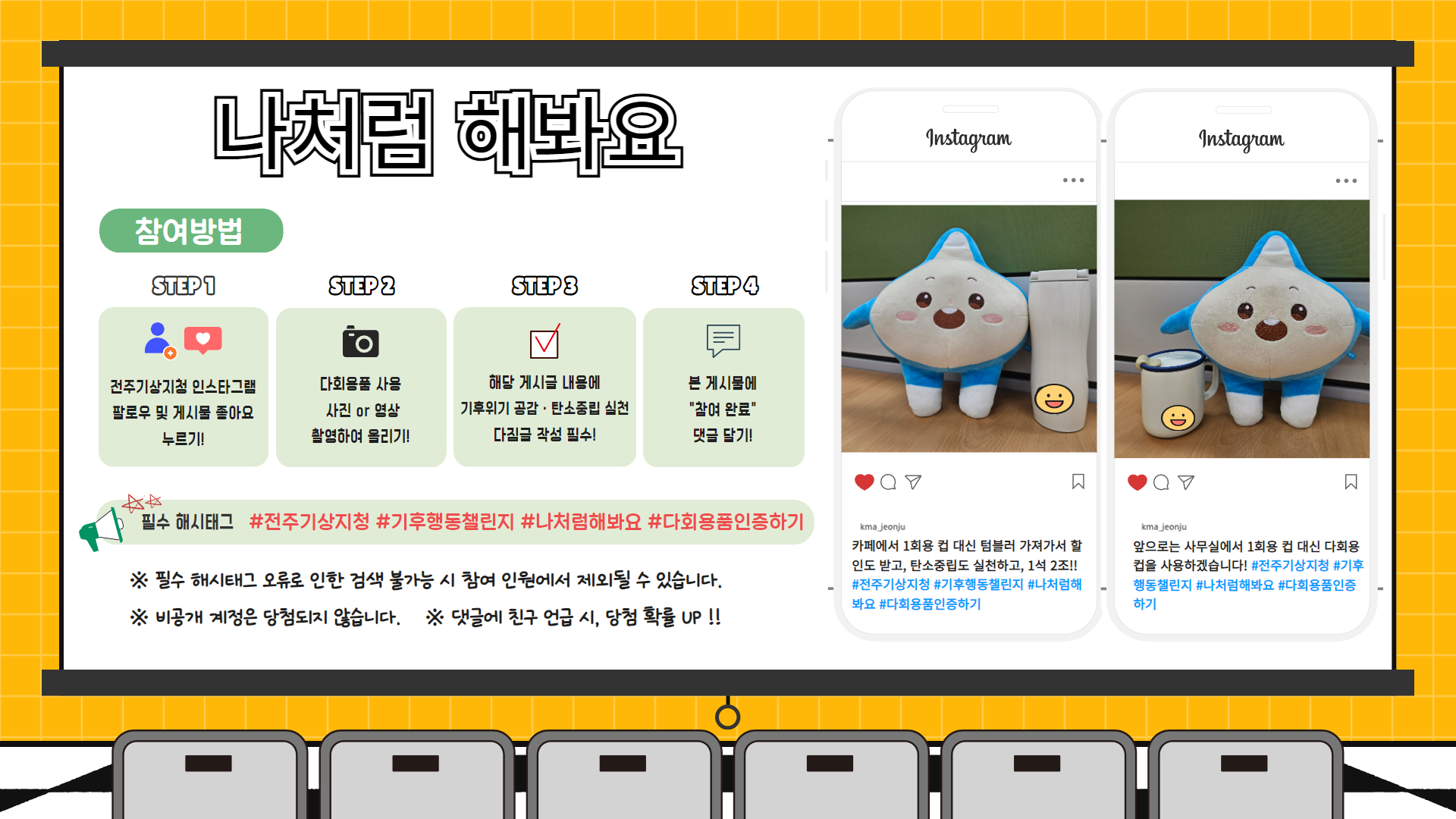 전주기상지청에서 기후위기 인식 확산 및 생활 속 탄소중립 실천문화 조성을 위해 '기후행동 챌린지' 참여프로그램을 붙임과 같이 운영하오니, 많은 시민들의 참여를 바랍니다.
