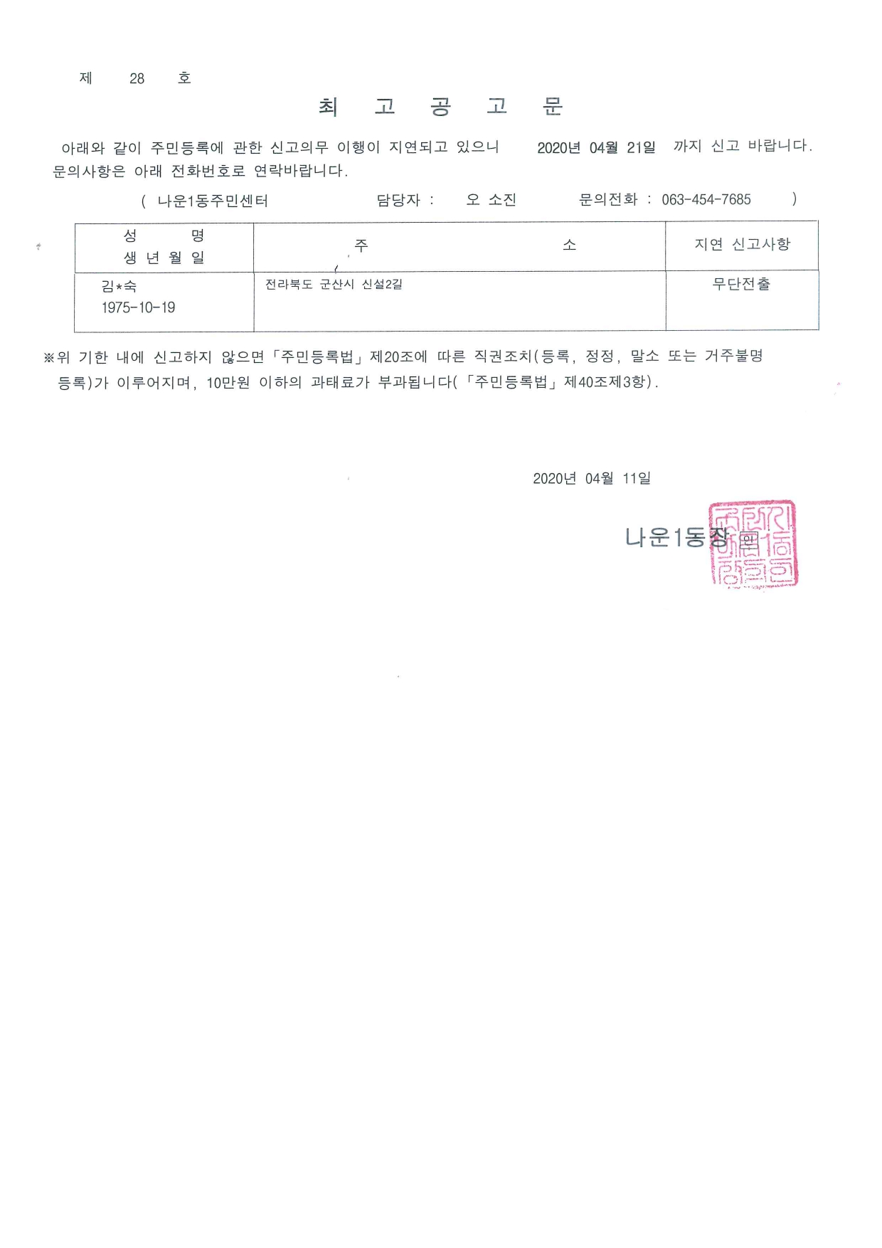 | 47 | 주민등록 의무이행 위반자 최고공고 |