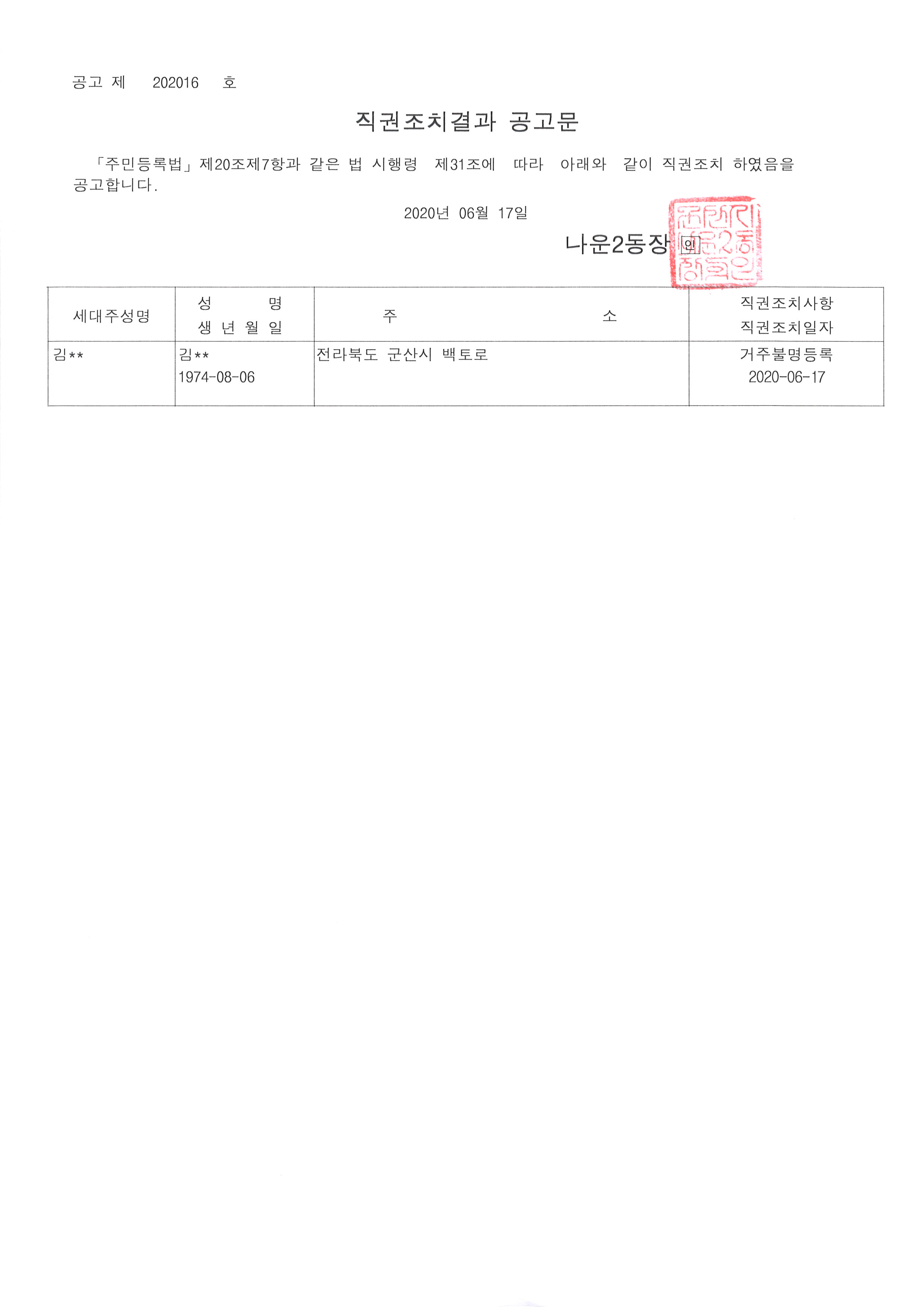 | 63 | 주민등록 신고의무 불이행자 직권조치결과 공고 |