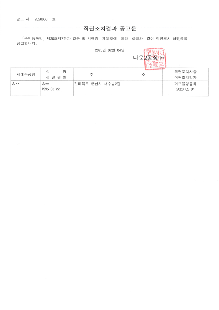 | 45 | 주민등록 신고의무 지연자 최고공고 |