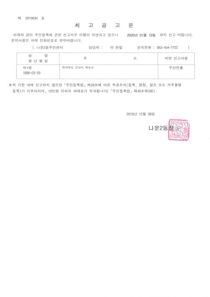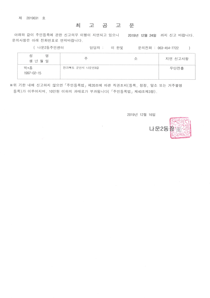 | 34 | 주민등록 신고의무 지연자 최고공고 |