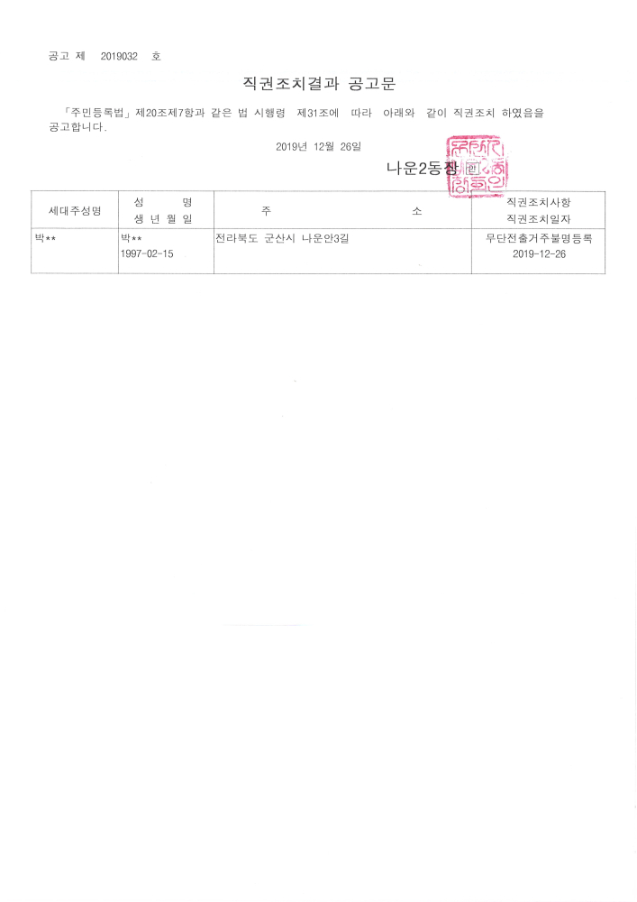 | 37 | 세대주 신고에 의한 주민등록 거주불명등록 공고 |