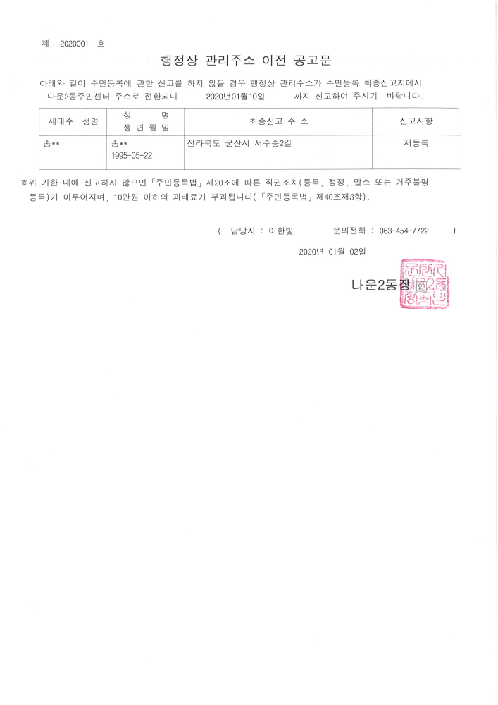 | 40 | 거주불명등록자 행정상 관리주소 이전 공고(2차) |