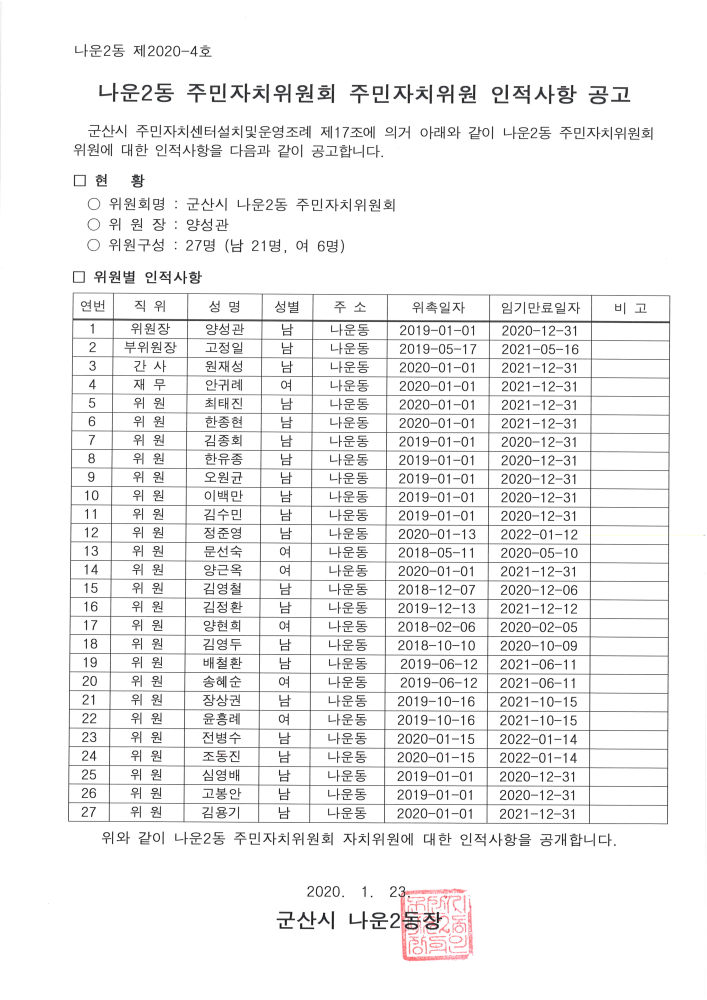 | 41 | 나운2동 주민자치위원회 주민자치위원 인적사항 공고 |