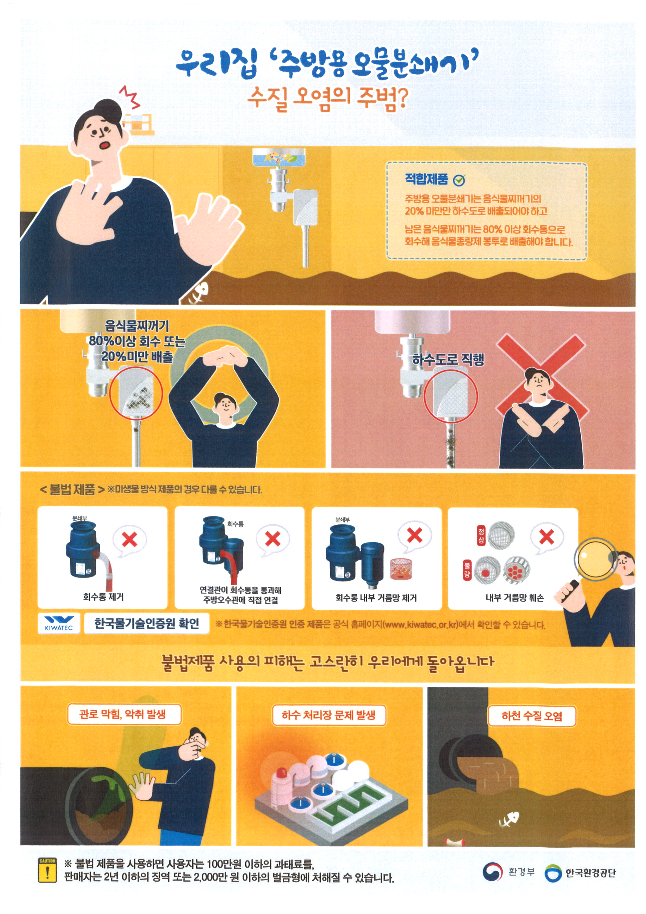 음식물 찌꺼기 전량을 하수도로 배출하는 불법 주방용 오물분쇄기 유통 및 사용으로 관로 막힘, 악취 발생, 하천 수질 악화가 우려되고 있으니 불법 주방용 오물분쇄기 사용을 금지하여 주시기 바랍니다.