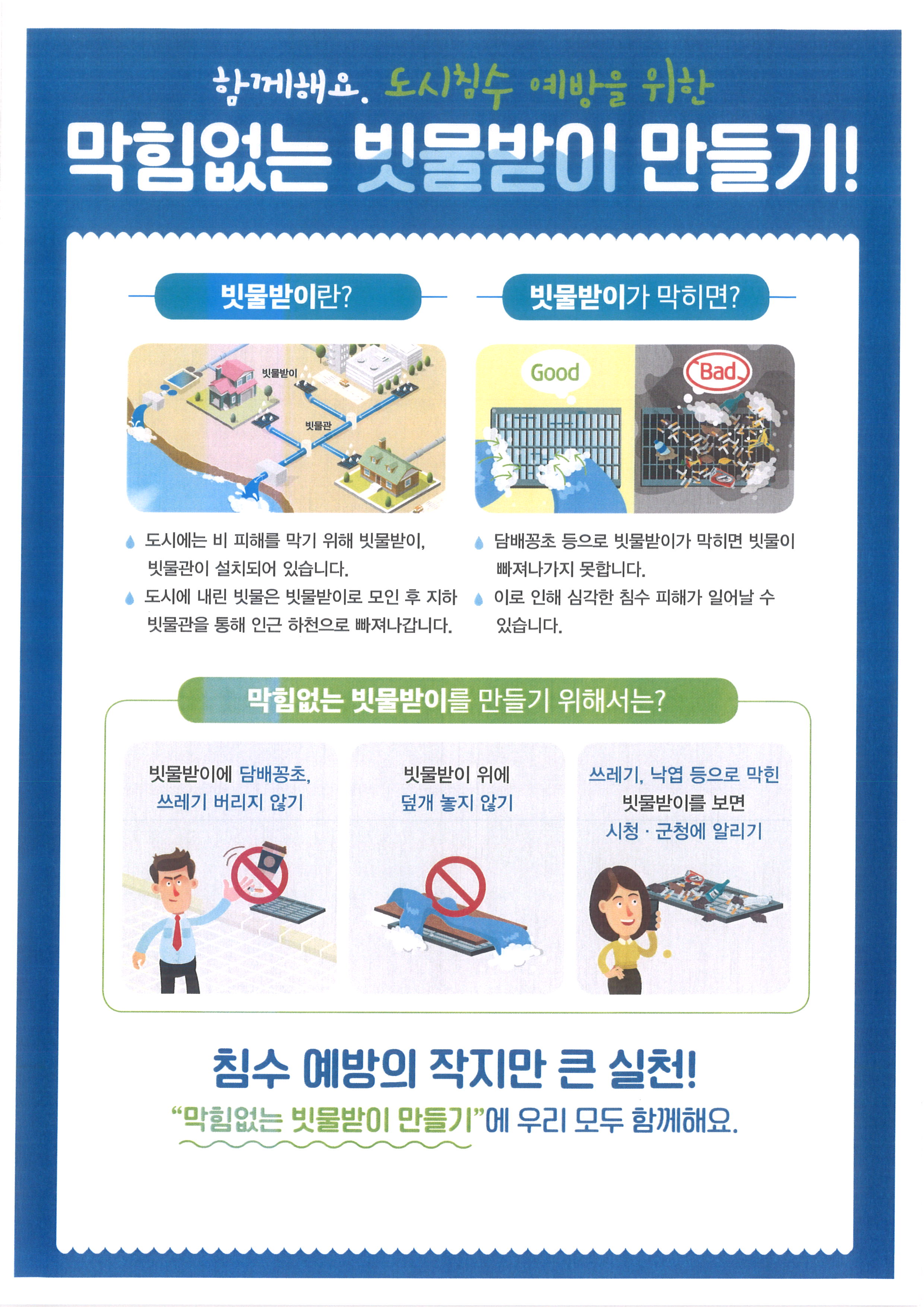침수피해 예방을 위해 막힘없는 빗물받이 만들기에 동참바랍니다.