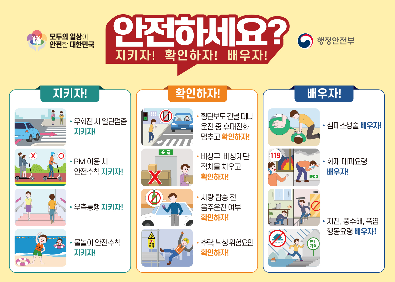 행정안전부는 국가 차원의 안전관리 및 재난 대응역량을 강화하고, 생활 속 안전문화 정착을 위한 안전문화운동 “안전 한바퀴”를 추진하고 있습니다.