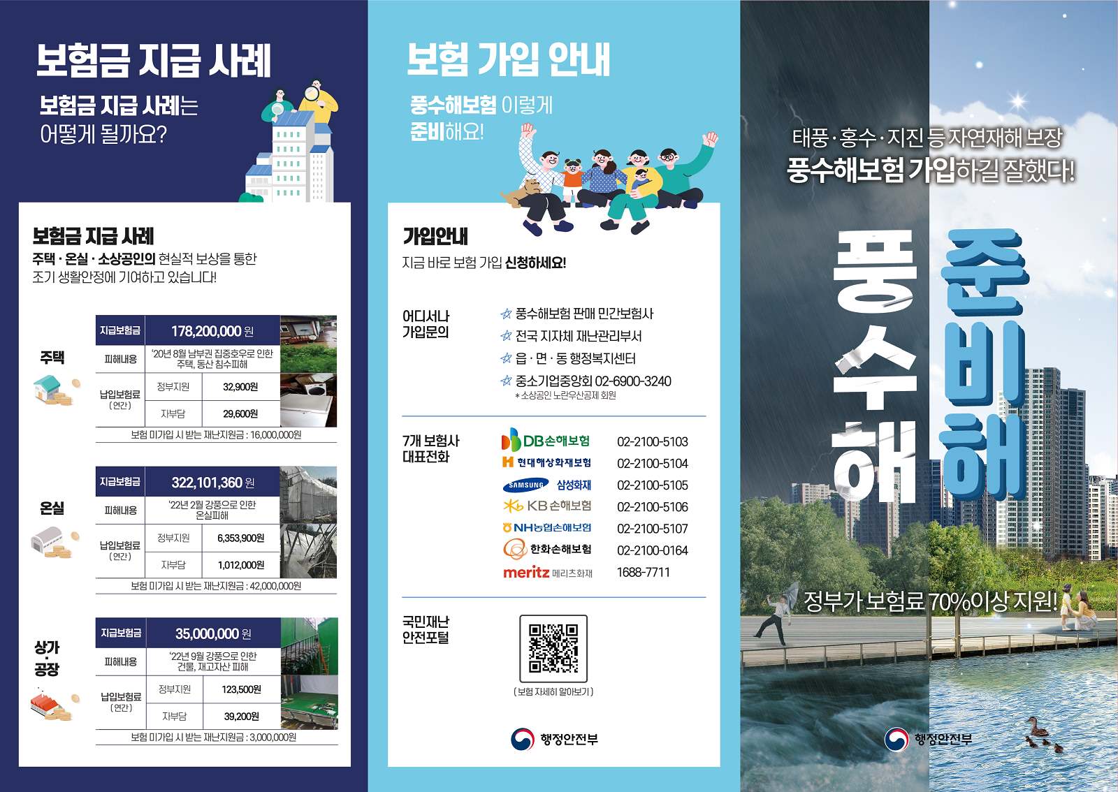 풍수해 보험 : 자연재해로 인한 재산피해를 보상하기위해 정부가 총 보험료의 70% 이상을 지원해 주는 보험입니다.
