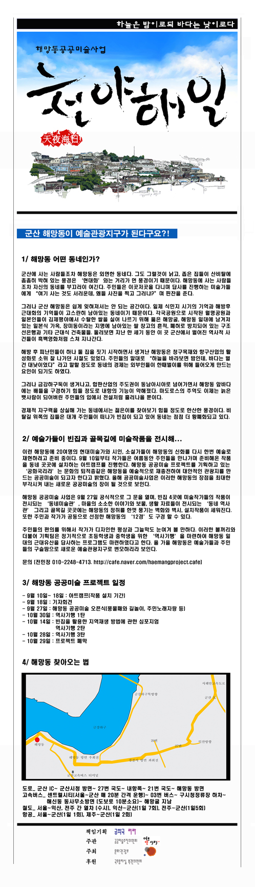 - 9월 27일 : 해망동 공공미술 오픈식(풍물패와 길놀이, 주민노래자랑 등)