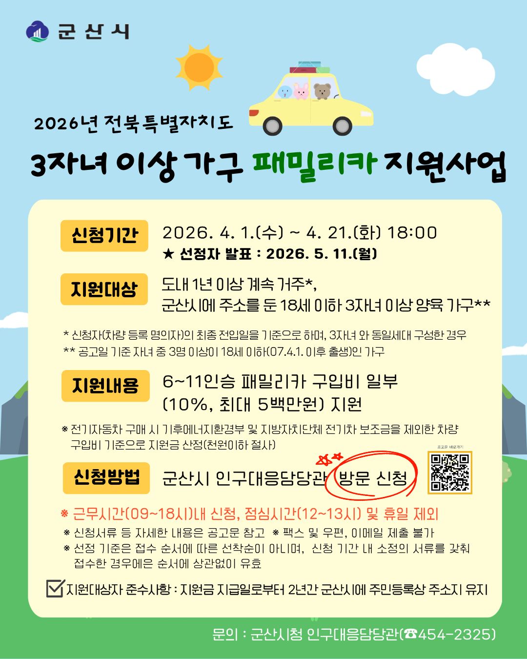 6. 신청방법 : 붙임 공고문 참고하여 서류 지참하여 인구대응담당관 사무실 방문신청
