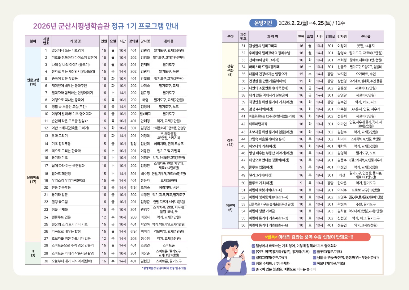 2026년 군산시평생학습관 정규 1기 프로그램 수강생 모집