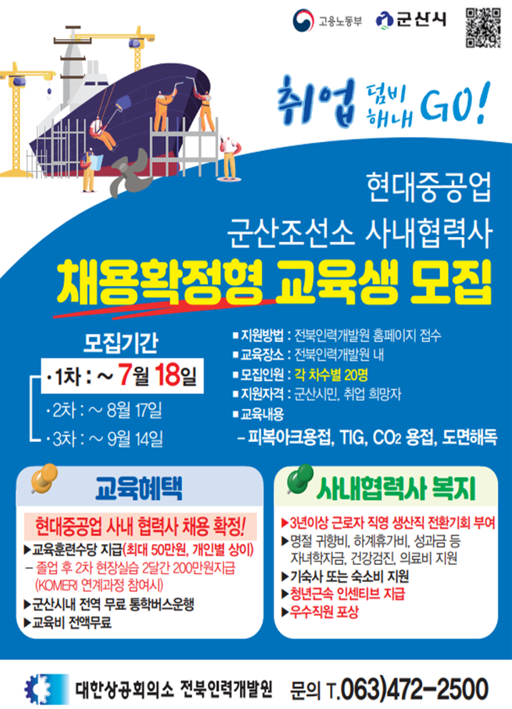 | 156 | 현대중 군산조선소 사내협력사채용확정형 교육생 모집(용접분야-전북인력개발원) |