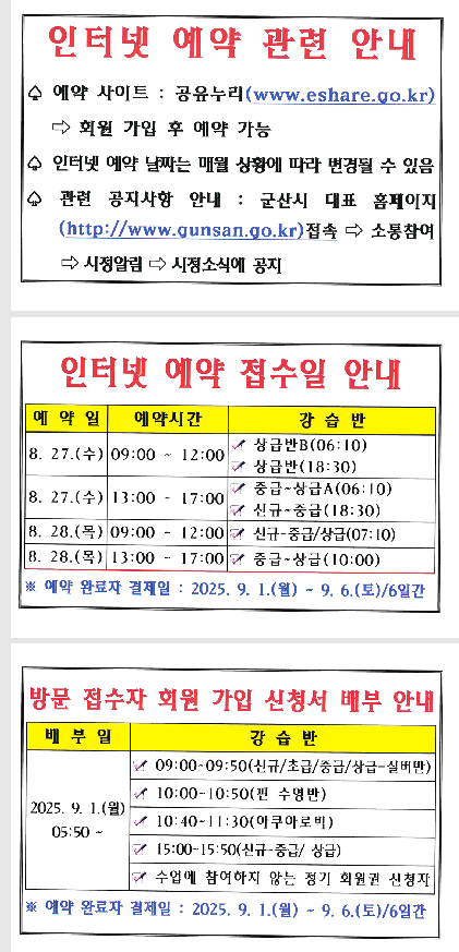 2. 인터넷 예약 접수일 : (성인반) - 2025. 8. 27.(수) ~ 8. 28.(목) / (어린이반 추가 모집 없음)*첨부 파일 참조